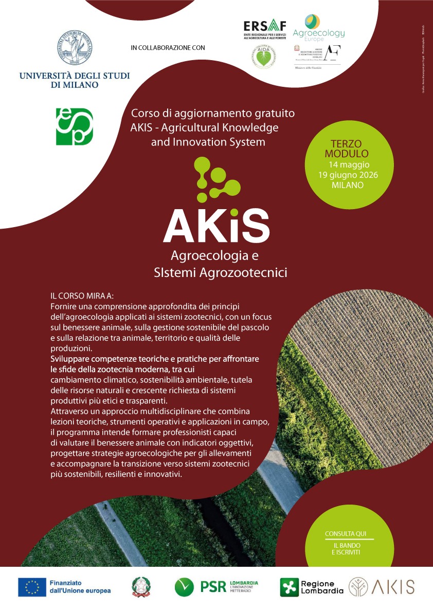 Sono aperte fino al 28 aprile 2026 le iscrizioni alla seconda edizione del corso di aggiornamento “AKIS4AE – Agricultural Knowledge Information System for Agroecology – Formazione in Agricoltura e Sistemi Alimentari Locali”, dedicato quest’anno all’agroecologia applicata ai sistemi zootecnici.